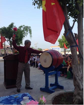 Kết thúc bài phát biểu, thầy giáo Hoàng Xuân Cường-Hiệu trưởng nhà trường đánh hồi trống Khai giảng năm học mới, năm học 2015-2016.