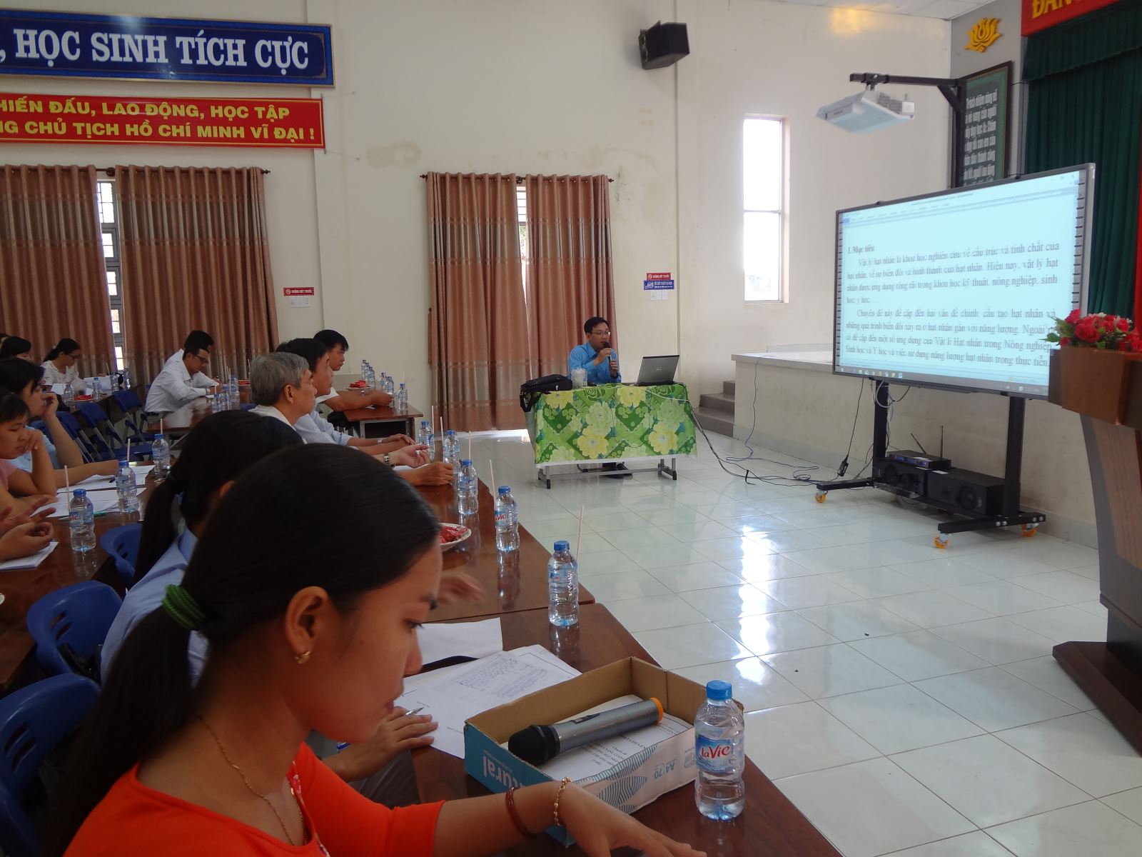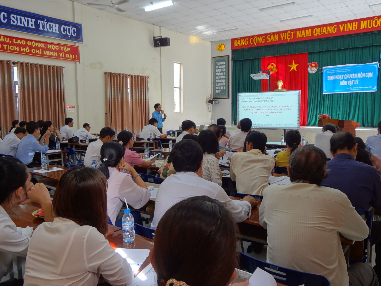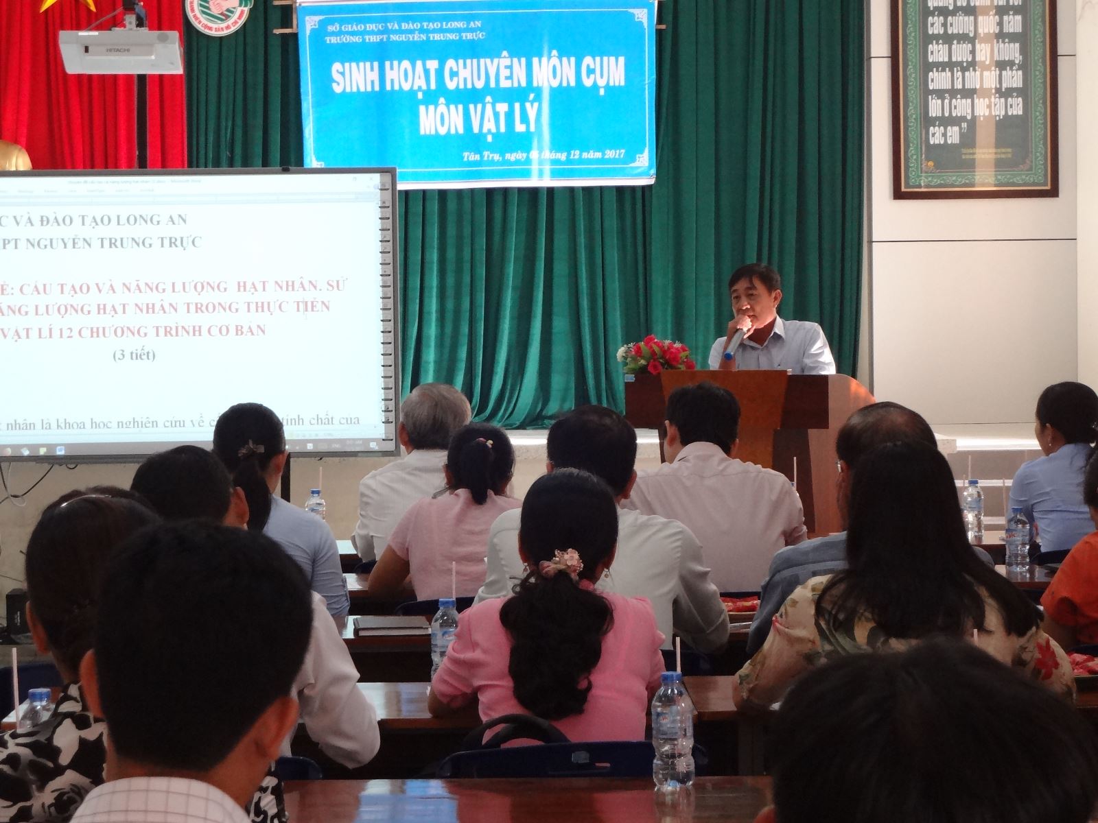 Căn cứ "Hướng dẫn thực hiện nhiệm vụ giáo dục trung học năm học 2017 - 2018 của Sở GD&ĐT Long An", trường THPT Nguyễn Trung Trực đã tổ chức buổi sinh hoat chuyên môn bộ môn Vật lí. Ban giám hiệu và tập thể giáo viên trường Nguyễn Trung Trực rất hoan nghênh quý đại biểu đến dự sinh hoạt chuyên môn bộ môn Vật lí chuyên đề: "Cấu tạo và năng lượng hạt nhân. Sử dụng năng lượng hạt nhân trong thựa tiễn".